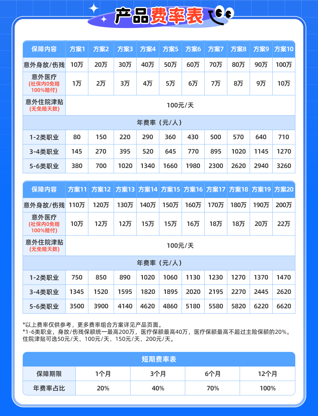 团体意外险-常规方案对比统计表(医疗免赔100元,住院津贴免赔3天)